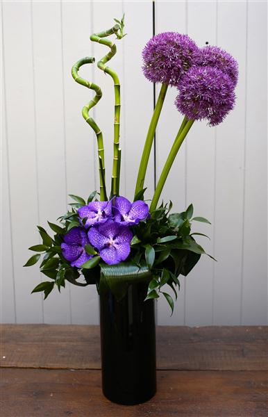 A modern structural arrangement of Alium, Vanda Orchid and Lucky Bamboo.