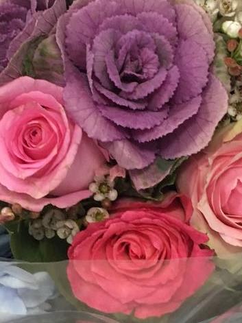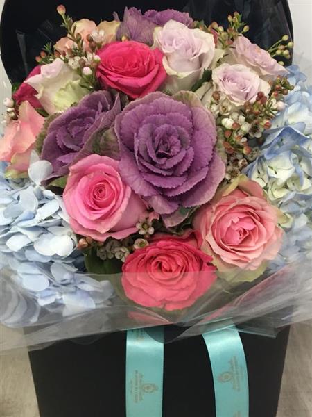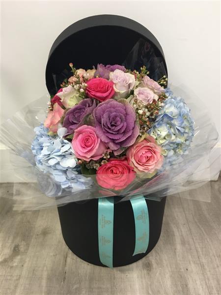 A hatbox filled with blue Hydrangeas, antique lilac and pink roses with cerise roses and purple brassica, waxflower finishing off this beautiful fresh flower hatbox.