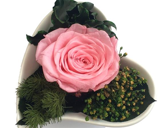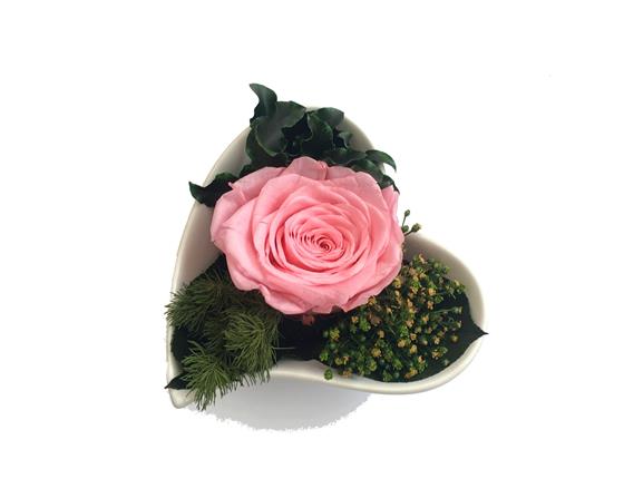 Carmen features a beautifully preserved rose surrounded by a blend of lush foliage and textured leaves, symbolising love and friendship. Presented in a heart-shaped porcelain dish, each element is naturally preserved with a plant-based formula to last for years, not days.