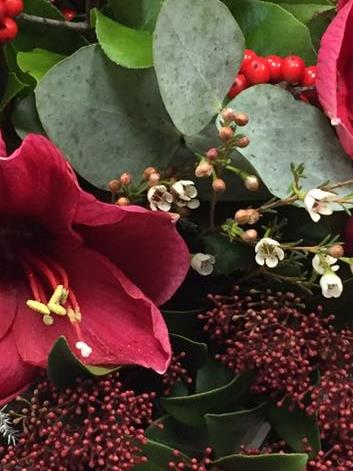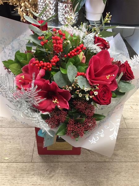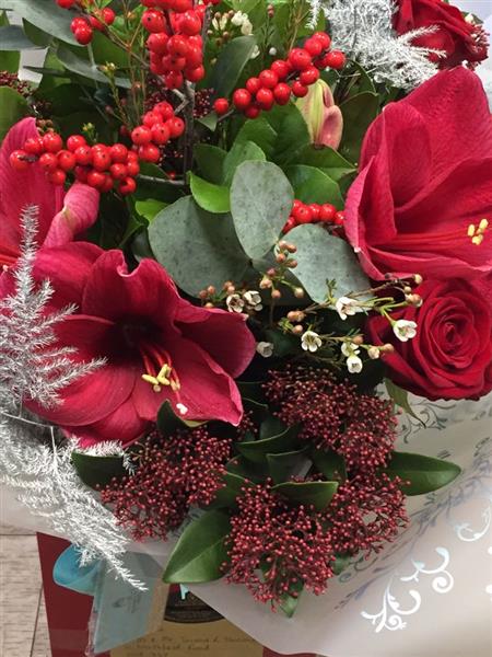 This spectacular, ravishing red bouquet with red roses, festive red amaryllis, Ilex berries, noble Fir, sedum and festive foliage creates Christmas chic in any home.