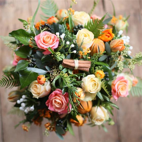 A beautiful bouquet of seasonal flowers in Oranges and Peaches.
