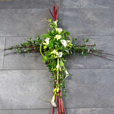 A contemporary and classic piece that is both elegant and extremely sophisticated. Containing peaceful white calla lilies and white freesia arranged in and amongst a fine selection of premium foliage. This floral tribute, really is a stunning collaboration of exclusive flowers that will show your sympathies and utmost respect.