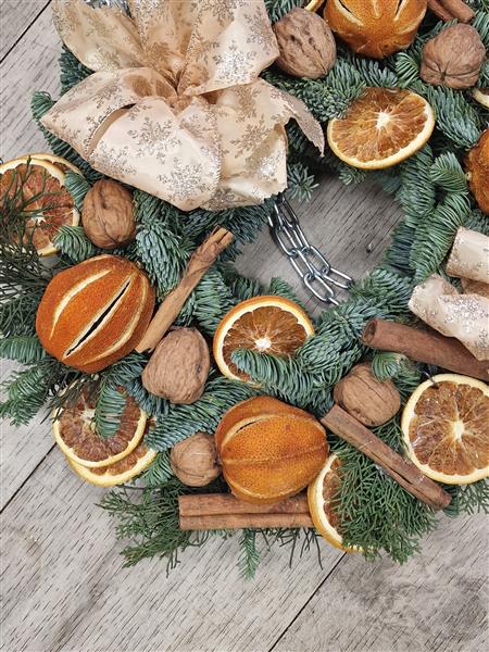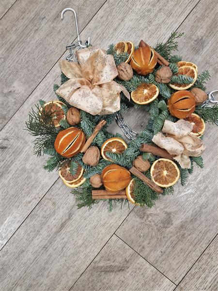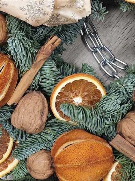 Our Delightful Oranges wreath handmade with nobilis fir, dried oranges, and cinnamon sticks. This traditional Christmas wreath provides a heavenly scent to match the mood of the season. Hang it on the front door to greet guests or on the wall inside for a fragrant boost.