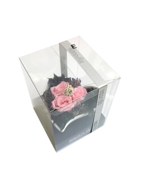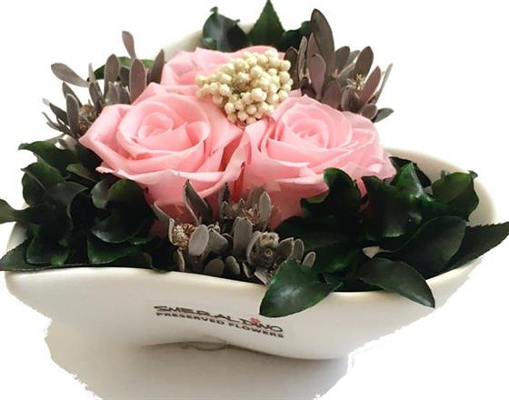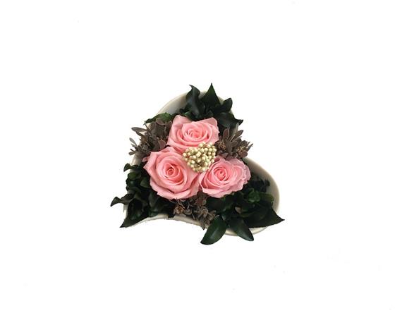 Erica features three delicate preserved mini roses, artfully arranged with a variety of lush foliage in a heart-shaped porcelain dish — a graceful symbol of love and friendship.