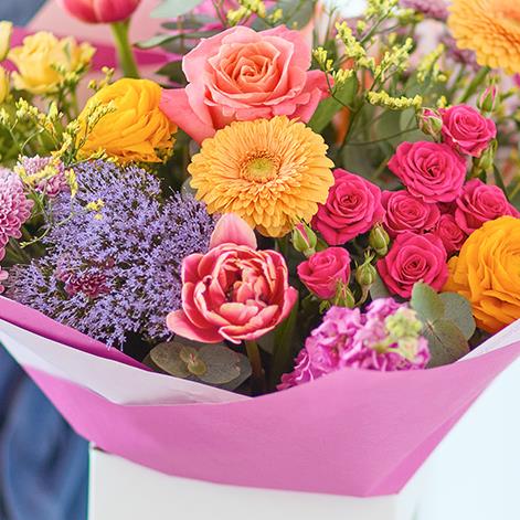 A bouquet of fresh, vividly coloured flowers expertly arranged by a local florist.