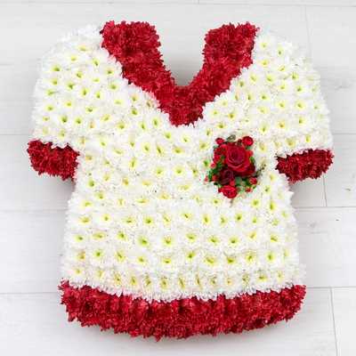 Double Spray Chrysanthemums are used to create this red and white Football Shirt design.