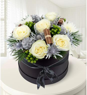 A beautifully balanced selection of white Avalanche Roses, white Lilies, green Hypericum, pinus, silver thistle, pine cones, and cinnamon sticks for that final festive touch.