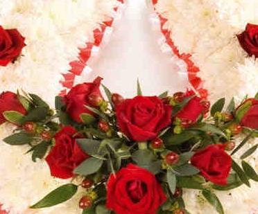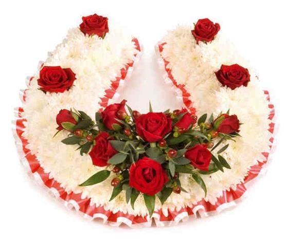 A beautiful horse shoe funeral arrangement with a spray of Red Roses.