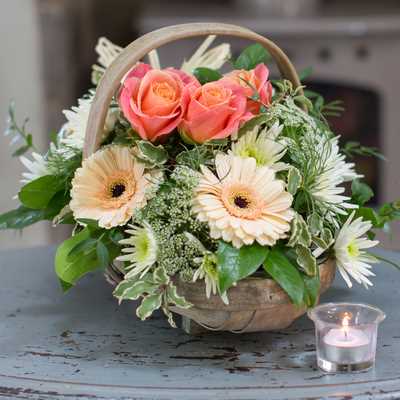 This country-chic garden style trug arrangement has a real rustic feel and is an ideal sympathy gift if looking for something a little different. The cream germini and delian spray chrysanthemums are perfectly complimented by the vibrant orange roses, massed on a bed of natural and fresh green foliage. A simple yet effective way to show sympathy and grief over the loss of a cherished one.