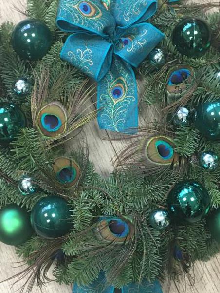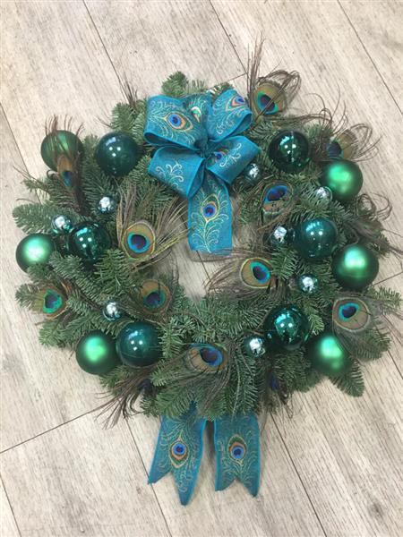 This one-of-a-kind wreath has a luxurious peacock design ribbon that gracefully intertwines with carefully chosen blue and green baubles, adding a touch of festive glamour. The vibrant peacock feathers, meticulously placed throughout, lend an air of regality and uniqueness to this enchanting creation.