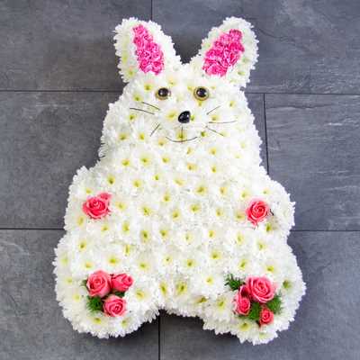 The rabbit floral tribute really is a pretty and quite delicate piece, combining white double spray chrysanthemums with pale pink roses and pink spray carnations which make this floral tribute ever so sweet, sent with both love and deepest sympathy.
