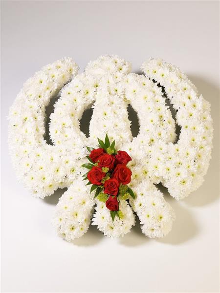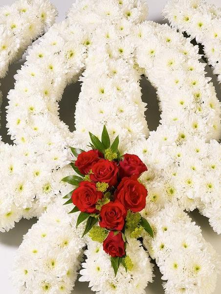 A mass of double spray chrysanthemums forms the Khanda symbol tribute which is finished with a spray of red roses, buplerum and foliage.