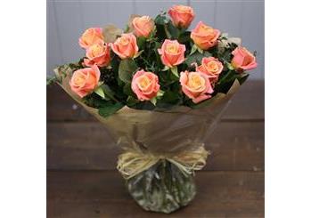 12 Long Stemmed, large headed Roses expertly hand tied with seasonal foliage.