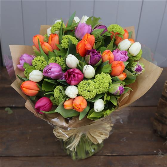 Tulips from Amsterdam isn't just a catchy song by Max Bygraves it's also the name of this gorgeous mixed colored tulip hand tied bouquet.